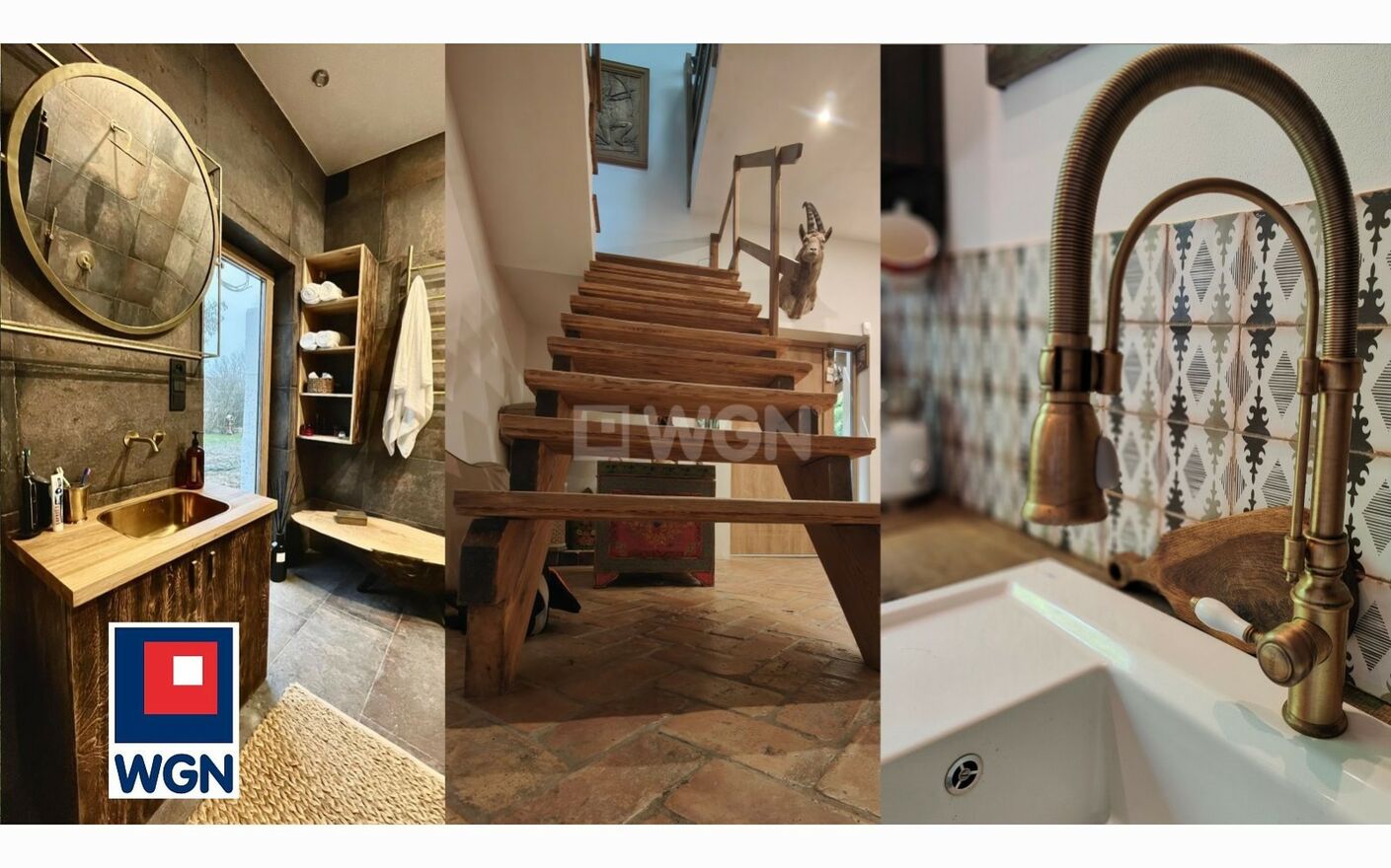 Poprzez aranżację i wykończenie z użyciem wyjątkowych, naturalnych materiałów jak prawdziwe drewno dębowe z którego wykonane są meble, blaty, podłogi czy elementy dekoracyjne, stara, 200-letnia cegła, z której wykonano posadzki na parterze, kamień na posadzce i ścianach łazienki.