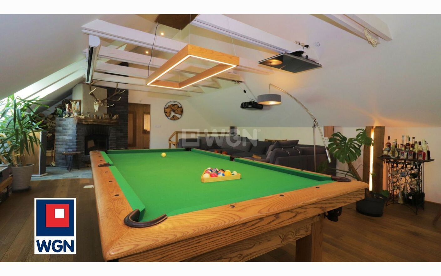 Na piętrze znajdziesz salon, który zachęca do zaproszenia i spędzenia czasu z przyjaciółmi - wykonany na indywidualne zamówienie stół bilardowy, strefę relaksu czy kominek, przy którym spędzisz niezapomniane wieczory.